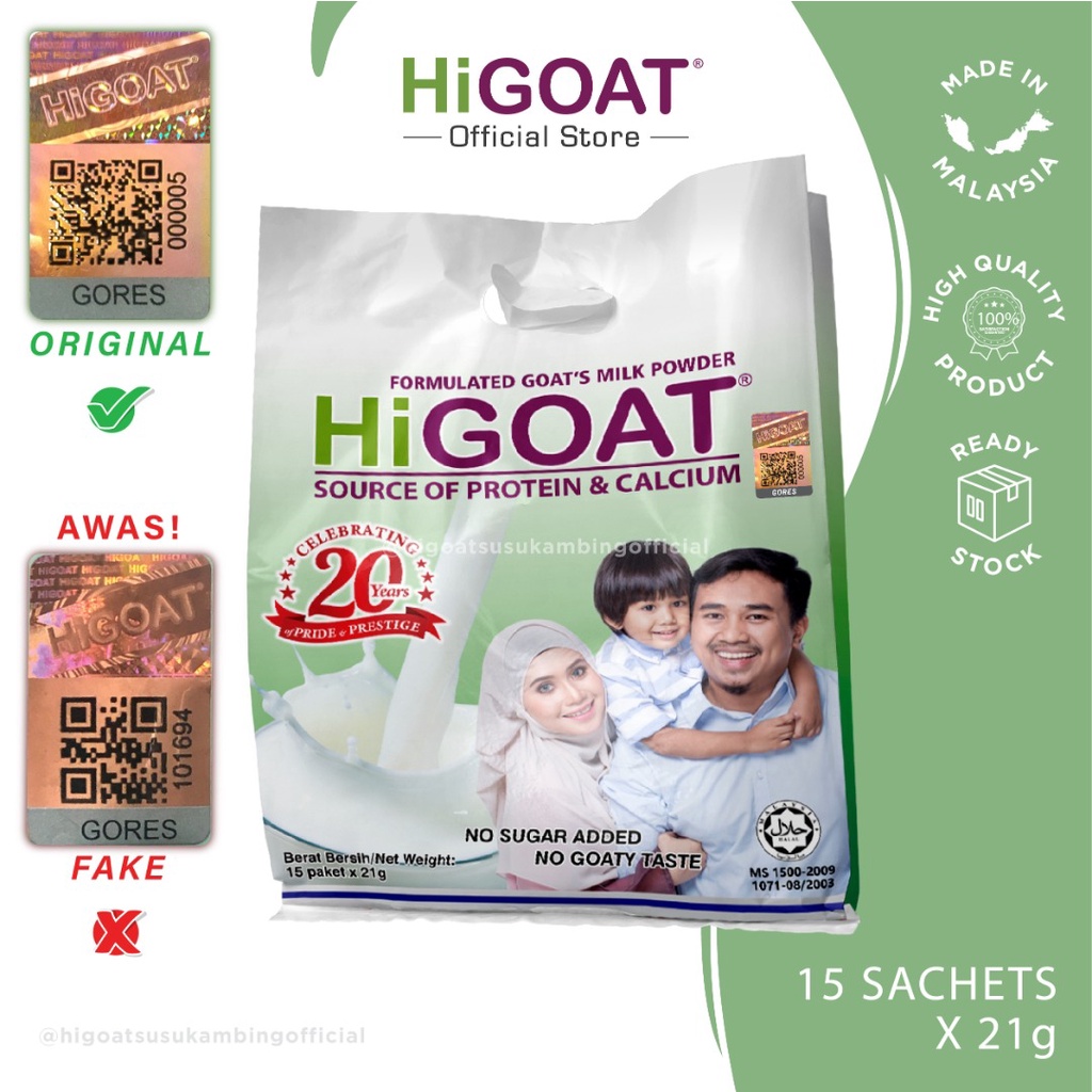 Susu kambing HiGOAT Original Murni Tanpa Campuran diambil dari perahan Susu Kambing Saanen berbentuk serbuk berisi 20 sachet 21gram. Sumber dari buku yang berjudul khasiat dan manfaaat susu kambing Susu terbaik dari hewan. HR Manufacturing Sdn Bhd.